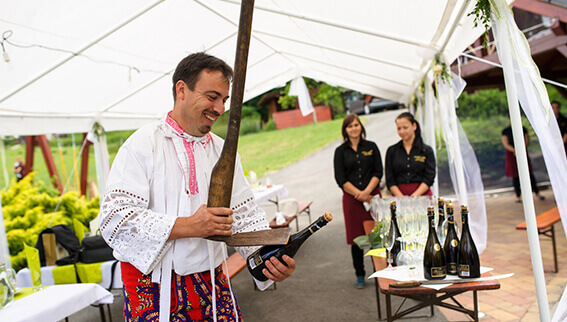 Nabízíme přípitek formou „Sabrage“, která dodá nezaměnitelné slavnostní zahájení každé oslavě. Jedná se o starodávnou francouzskou metodu sekání sektů z dob napoleonských válek. Tradičním nástrojem pro tuto techniku je šavle. V dnešní době používáme pro zpestření celou řadu dalších nástrojů, například motyku.